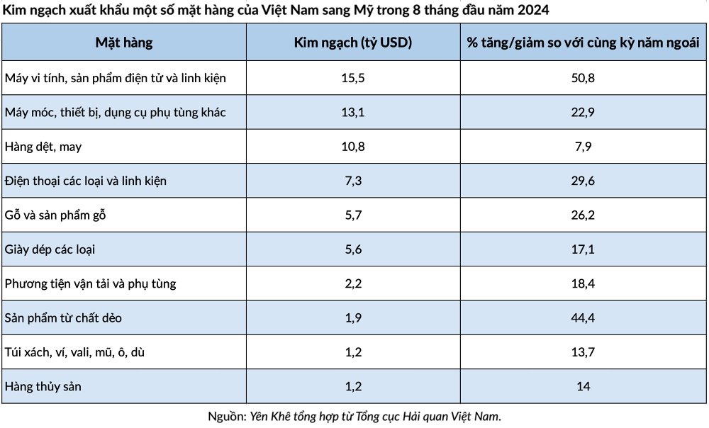 Về các hàng hoá xuất khẩu sang Mỹ trong 8 tháng đầu năm, đứng đầu vẫn là máy vi tính, sản phẩm điện tử và linh kiện. Theo dữ liệu từ Tổng cục Hải quan Việt Nam, kim ngạch của nhóm hàng này đạt 15,5 tỷ USD - tăng 50,8% so với cùng kỳ.