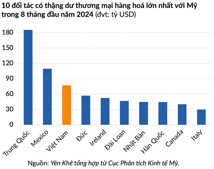 Qua đó, Việt Nam ghi nhận thặng dư thương mại hàng hoá khoảng 77,6 tỷ USD với nền kinh tế số một thế giới, đứng thứ ba trong danh sách sau Trung Quốc và Mexico.