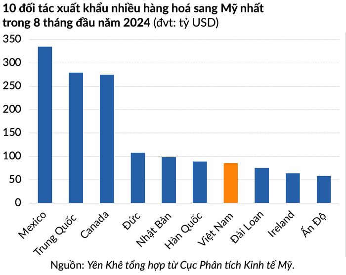 Mexico - nước xuất khẩu hàng hoá lớn nhất sang Mỹ - cũng là một đối tác có nguy cơ chịu thiệt hại nặng nề bởi các đề xuất thuế quan của ông Trump. Trong 8 tháng đầu năm nay, Mexico xuất khẩu tổng cộng 334,7 tỷ USD hàng hoá sang Mỹ.
