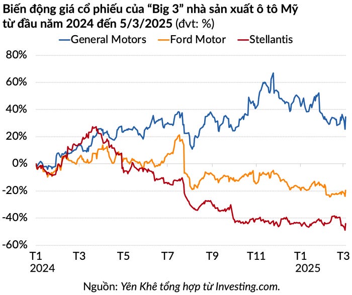 Cổ phiếu của General Motors, Stellantis và Ford bật tăng đáng kể sau thông báo từ Nhà Trắng. Kết phiên giao dịch ngày 5/3, cổ phiếu Stellantis tăng 9,2%, theo sau là General Motors 7,2% và Ford 5,8%.