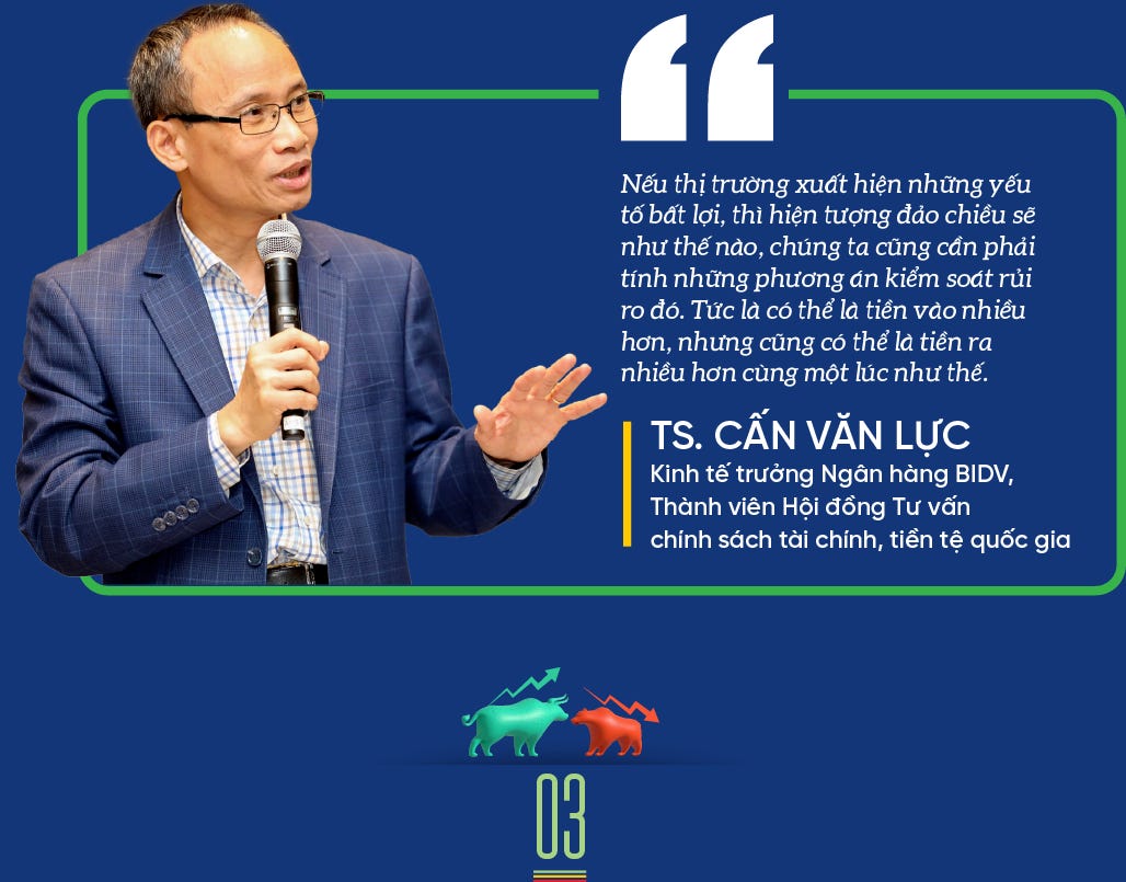 Hai là, nếu thị trường xuất hiện những yếu tố bất lợi, thì hiện tượng đảo chiều sẽ như thế nào, chúng ta cũng cần phải tính những phương án kiểm soát rủi ro đó. Tức là có thể là tiền vào nhiều hơn, nhưng cũng có thể là tiền ra nhiều hơn cùng một lúc như thế.