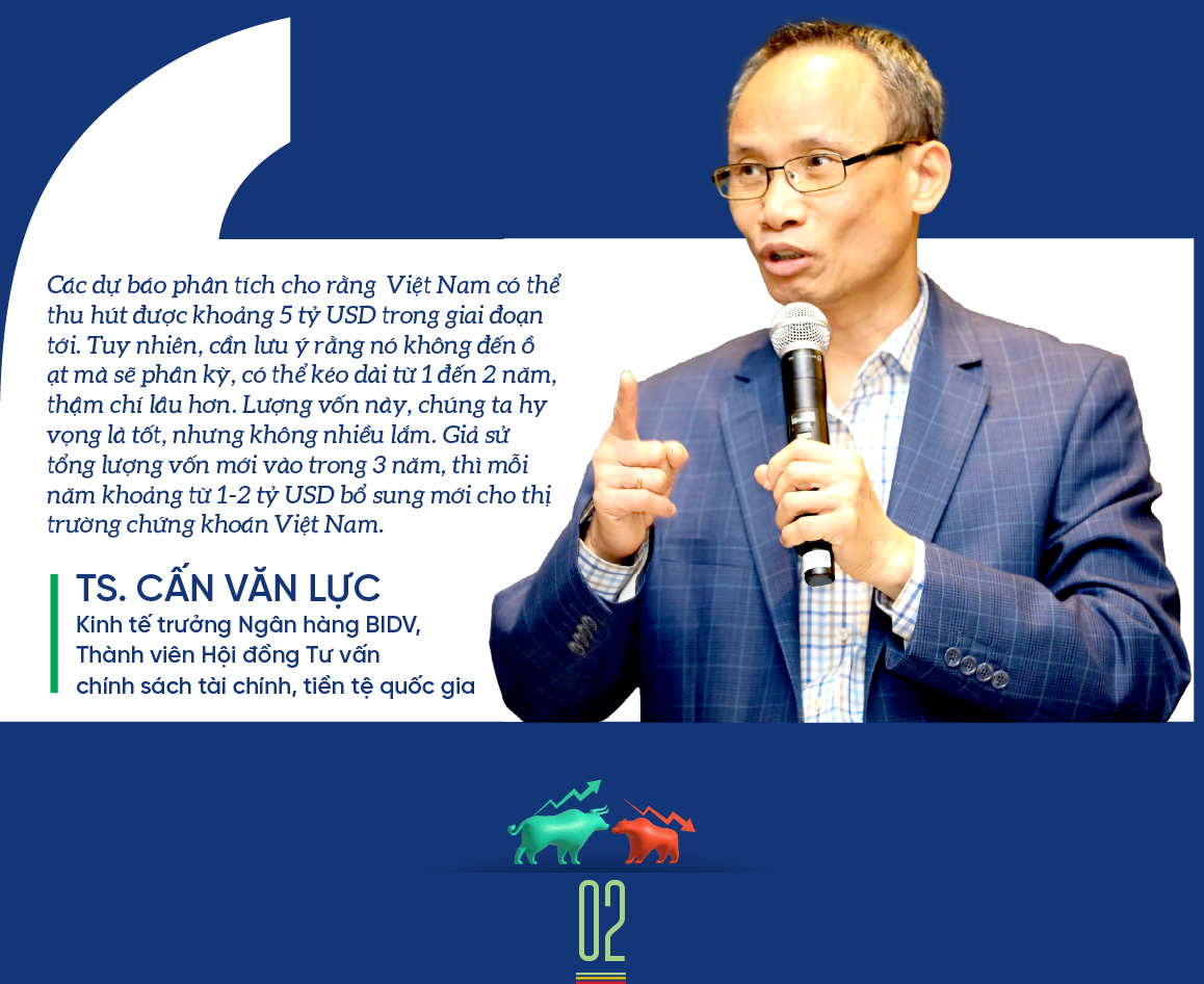 Các dự báo phân tích cho rằng Việt Nam có thể thu hút được khoảng 5 tỷ USD trong giai đoạn tới. Tuy nhiên, cần lưu ý rằng nó không đến ồ ạt mà sẽ phân kỳ, có thể kéo dài từ 1 đến 2 năm, thậm chí lâu hơn. Lượng vốn này, chúng ta hy vọng là tốt, nhưng không nhiều lắm. Giả sử tổng lượng vốn mới vào trong 3 năm, thì mỗi năm khoảng từ 1-2 tỷ USD bổ sung mới cho thị trường chứng khoán Việt Nam.