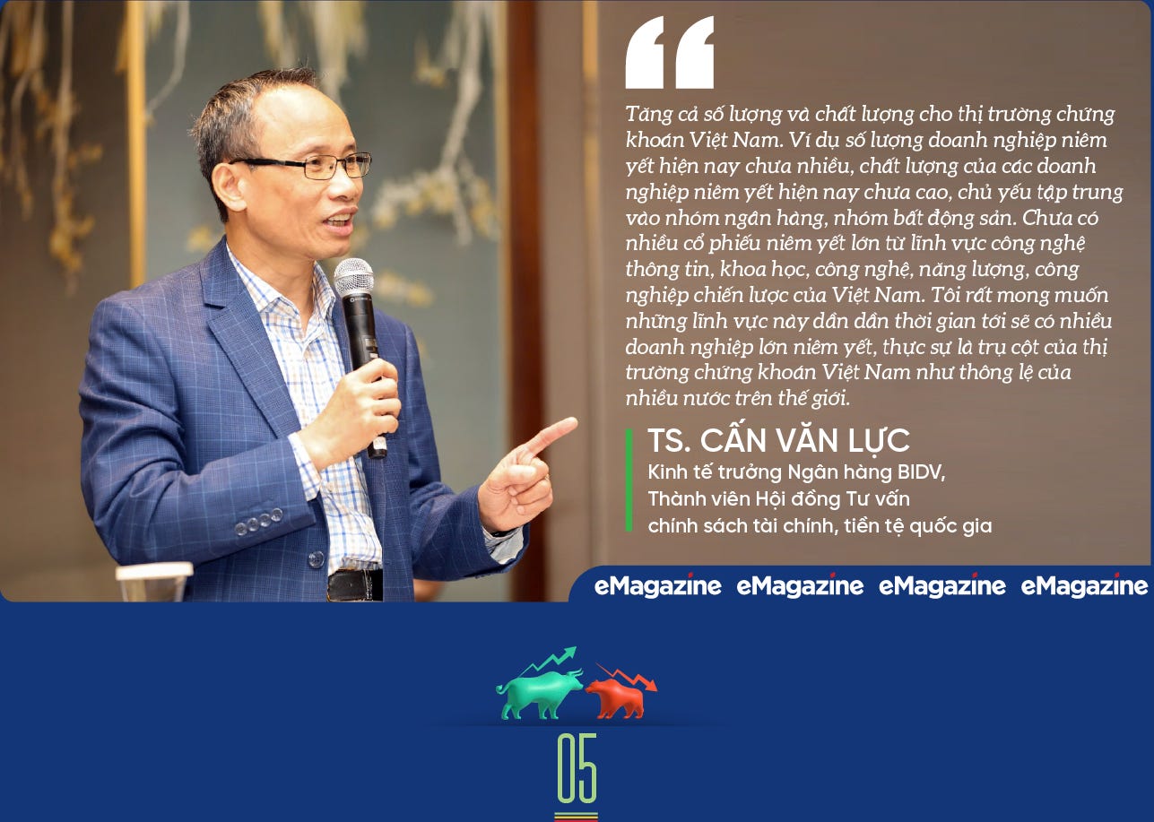 Nhóm giải pháp thứ nhất, tăng cả số lượng và chất lượng cho thị trường chứng khoán Việt Nam. Ví dụ số lượng doanh nghiệp niêm yết hiện nay chưa nhiều, chất lượng của các doanh nghiệp niêm yết hiện nay chưa cao, chủ yếu tập trung vào nhóm ngân hàng, nhóm bất động sản. Chưa có nhiều cổ phiếu niêm yết lớn từ lĩnh vực công nghệ thông tin, khoa học, công nghệ, năng lượng, công nghiệp chiến lược của Việt Nam. Tôi rất mong muốn những lĩnh vực này dần dần thời gian tới sẽ có nhiều doanh nghiệp lớn niêm yết, thực sự là trụ cột của thị trường chứng khoán Việt Nam như thông lệ của nhiều nước trên thế giới.