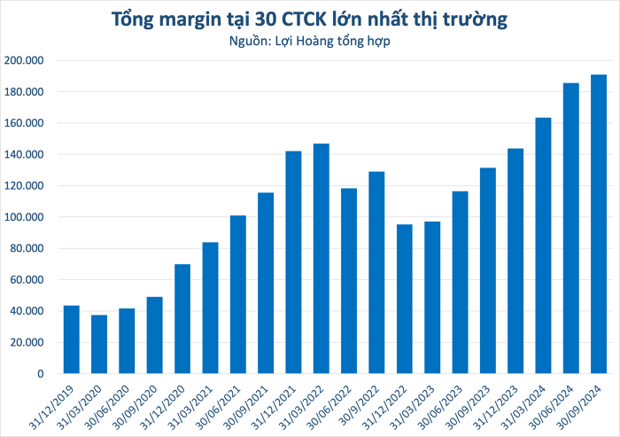 Thống kê quy mô của 30 công ty chứng khoán có dư nợ lớn nhất cho thấy tổng dư nợ đạt khoảng 191.000 tỷ đồng, cao hơn 5.500 tỷ đồng so với quý trước đó. Sau 9 tháng, tổng dư nợ cho vay ký quỹ của Top 30 tăng trưởng khoảng 47.200 tỷ đồng.