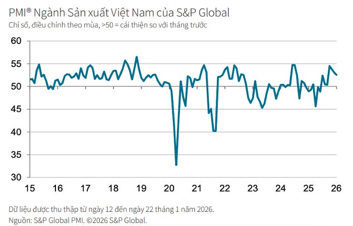 Chỉ số Nhà Quản trị Mua hàng - Manufacturing Purchasing Managers’ Index™ (PMI) ngành sản xuất Việt Nam của S&P Global đạt kết quả 52,5 điểm trong tháng 1, giảm nhẹ so với mức 53,0 điểm của tháng 12 nhưng vẫn nằm trên hẳn ngưỡng 50,0 điểm, cho thấy sự cải thiện rõ ràng hàng tháng về điều kiện kinh doanh vào đầu năm 2026.