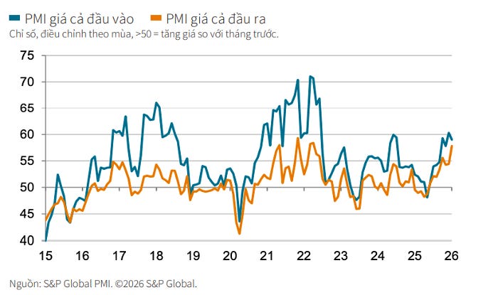 PMI giá cả đầu vào và đầu ra giai đoạn 2015 đến nay.(Nguồn: S&P Global).