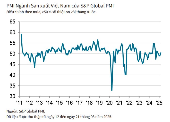 Điều này giúp chỉ số Nhà Quản trị Mua hàng - Manufacturing Purchasing Managers' Index™ - (PMI) ngành sản xuất Việt Nam tháng 3 đạt 50,5 điểm. S&P Global, đơn vị công bố chỉ số này cho biết, việc PMI Việt Nam vượt ngưỡng 50 điểm báo hiệu sự cải thiện các điều kiện kinh doanh vào thời điểm cuối quý I/2025.