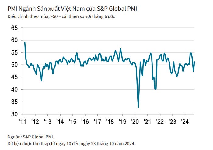 Theo S&P Global, tốc độ tăng của cả chi phí đầu vào và giá cả đầu ra đã nhanh hơn nhưng vẫn còn ở mức nhẹ. Chỉ số Nhà Quản trị Mua hàng - Manufacturing Purchasing Managers Index (PMI) ngành sản xuất Việt Nam của S&P Global đạt kết quả 51,2 trong tháng 10, tăng so với 47,3 điểm của tháng 9 và đã vượt lại lên trên ngưỡng 50 điểm sau khi chịu tình trạng gián đoạn do cơn bão Yagi gây ra trong tháng trước.