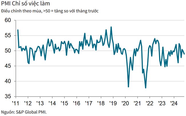 Trên thực tế, số lượng đơn đặt hàng mới từ nước ngoài đã giảm liên tục sau khi tăng nhẹ trong tháng trước đó, và hoạt động xuất khẩu đã giảm với mức mạnh nhất kể từ tháng 7/2023.