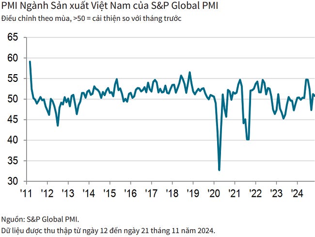 Chỉ số Nhà Quản trị Mua hàng (PMI) ngành sản xuất Việt Nam vẫn nằm trên ngưỡng 50 điểm trong tháng 11, từ đó cho thấy các điều kiện kinh doanh đã cải thiện tháng thứ hai liên tiếp sau khi suy giảm do cơ bão Yagi trong tháng 9. Tuy nhiên, kết quả 50,8 điểm là giảm so với 51,2 điểm của tháng 10, cho thấy sức khỏe ngành sản xuất chỉ mạnh lên ở mức khiêm tốn.