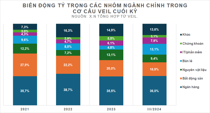 Cụ thể tại cuối tháng 9, VEIL ghi nhận ngân hàng chiếm 36% tỷ trọng, kế đến là bất động sản 16,9%, bán lẻ/tiêu dùng không thiết yếu 13,1%, nguyên vật liệu 9,4%, công nghệ thông tin 7,9%...