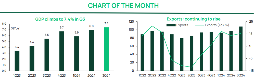 Sự phục hồi của tiêu dùng trong nước cũng đóng góp 47% vào mức tăng trưởng của quý III; doanh số bán lẻ tháng 9 tăng 7,6% so với cùng kỳ năm trước và 8,8% trong 9 tháng đầu năm 2024, nhờ vào sự tăng trưởng trong dịch vụ lưu trú và ăn uống và dịch vụ du lịch.