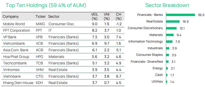 Danh mục VEIL ghi nhận trong 9 tháng đầu năm, ngân hàng và công nghệ đã gia tăng tỷ trọng 0,5 - 1,8 điểm phần trăm, bán lẻ tăng 8,3 điểm phần trăm. Chiều ngược lại, quỹ đã thu hẹp tỷ trọng danh mục bất động sản và nguyên vật liệu 3,1 - 3,7 điểm phần trăm.