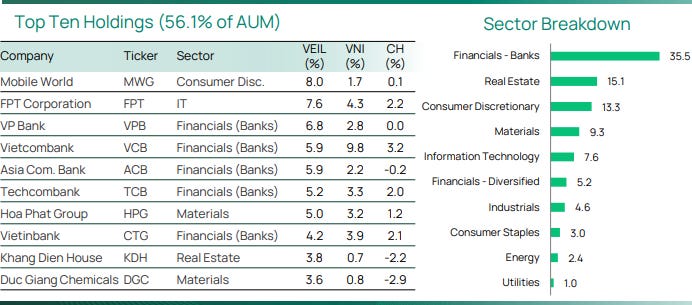 VEIL vẫn tự tin vào vị thế danh mục đầu tư nắm giữ, khi cho rằng lĩnh vực ngân hàng sẽ tiếp tục quỹ đạo tăng trưởng hiện tại, với kỳ vọng về việc mở rộng tín dụng bền vững vào năm 2025 từ các sáng kiến thúc đẩy tăng trưởng.