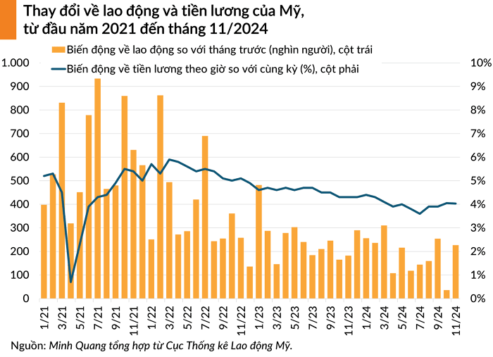 Tỷ lệ thất nghiệp trong tháng 11 tăng nhẹ lên 4,2%, đúng như dự kiến, trong khi thu nhập theo giờ tăng 4% so với cùng kỳ năm trước, cao hơn 0,1 điểm % so với dự báo.