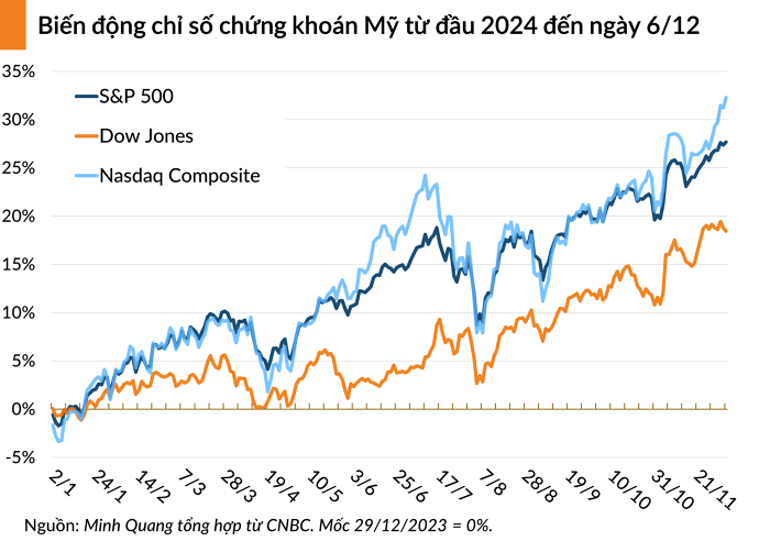 Ở chiều ngược lại, chỉ số trung bình công nghiệp Dow Jones giảm 123 điểm, tương đương 0,28% và đóng cửa với 44.463 điểm. Kết thúc tuần đầu tiên của tháng 12, S&P 500 và Nasdaq Composite lần lượt tăng 0,96% và 3,34%, trong khi Dow Jones đi lùi 0,6%.