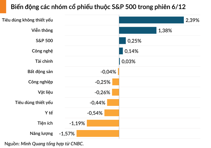 Theo CNBC, trong phiên giao dịch ngày 6/12, chỉ số S&P 500 tăng 0,25% lên 6.090 điểm. Chỉ số thiên về công nghệ Nasdaq Composite tăng 0,81% lên 19.860 điểm, được hỗ trợ bởi cổ phiếu Tesla, Meta (Facebook) và Amazon. Cả hai chỉ số này đều đạt mức đóng cửa kỷ lục.