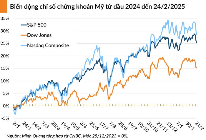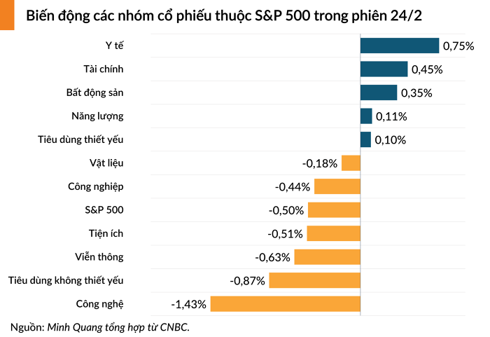 Theo CNBC, trong phiên giao dịch ngày 24/2, chỉ số S&P 500 giảm thêm 0,5% và kết thúc với 5.983 điểm. Chỉ số thiên về công nghệ Nasdaq Composite trượt 1,21%, đóng cửa ở mức 19.287 điểm.