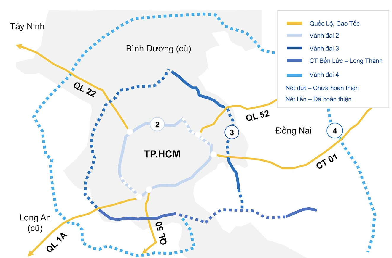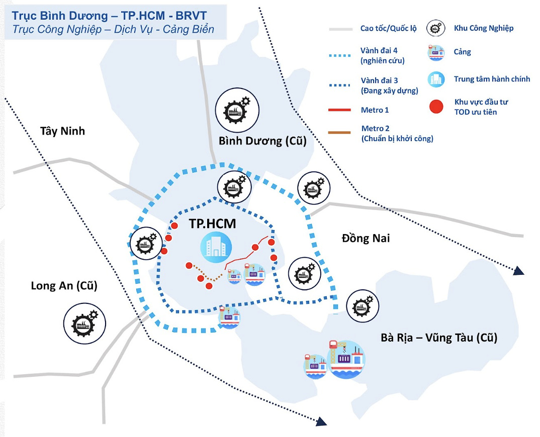 Các công trình trọng điểm như Vành đai 3, 4, các tuyến Metro 1, 2 tại TP HCM và Bình Dương, cùng với các tuyến cao tốc Trung Lương - TP HCM và sân bay quốc tế Long Thành đang hình thành trục kết nối đa chiều, liên vùng.
