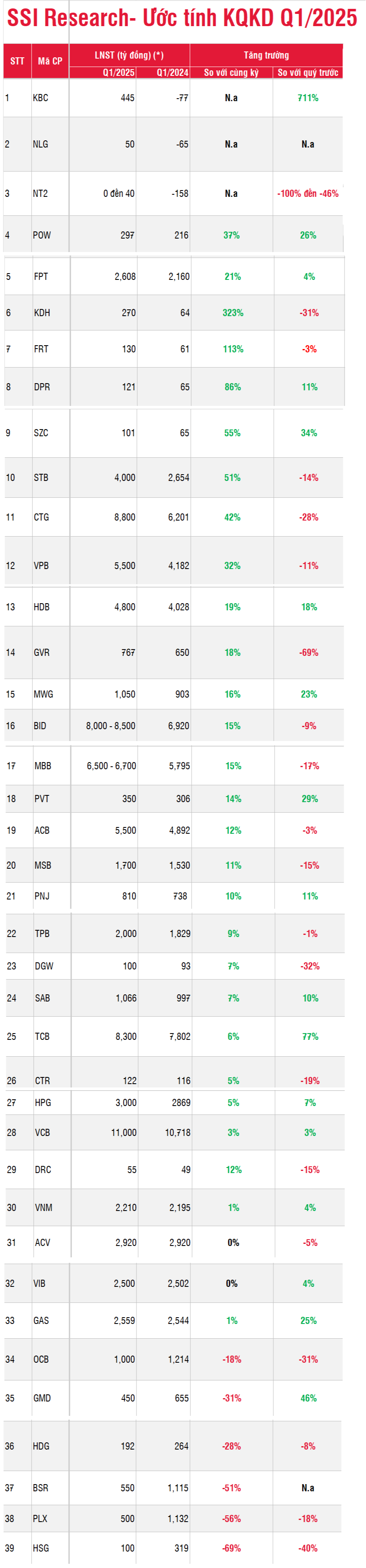 SSI ước tính lợi nhuận của 39 DN 'hot' quý 1/2025: Kinh Bắc tăng hơn 700% so với quý trước, Nhà Khang Điền, FPT Retail tăng bằng lần so với cùng kỳ