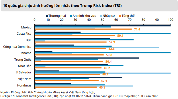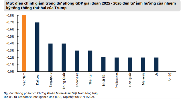 Báo cáo chiến lược tháng 11 của Chứng khoán Mirae Asset Việt Nam (MASVN) dẫn đánh giá từ Economist Intelligence Unit (EIU), Việt Nam nằm trong top 10 quốc gia dự kiến sẽ chịu tác động đáng kể trong nhiệm kỳ thứ hai của ông Trump.