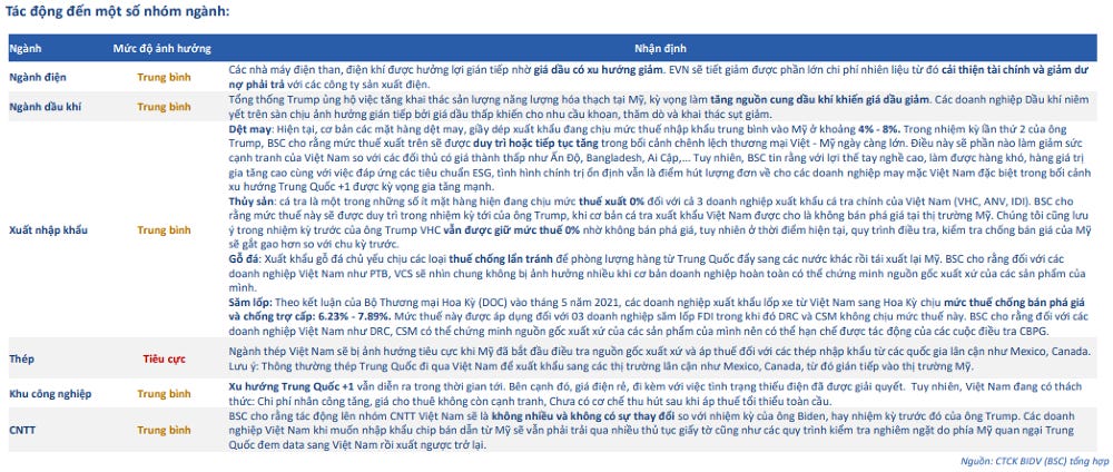 Theo phân tích mới đây, BSC Research, đánh giá ảnh hưởng từ nhiệm kỳ mới của ông Trum ở mức trung bình đối với các nhóm ngành điện, dầu khí, xuất nhập khẩu, khu công nghiệp, công nghệ thông tin.
