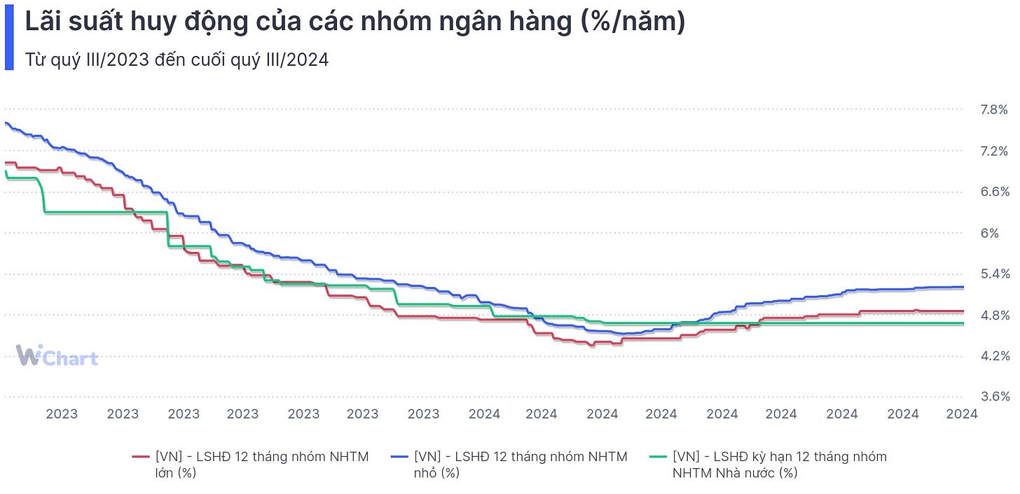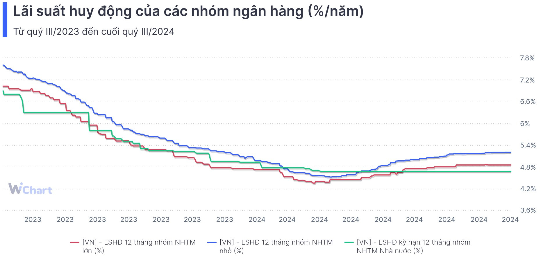 Dữ liệu từ WiChart cho thấy trong quý III/2023, lãi suất huy động kỳ hạn 12 tháng của nhóm ngân hàng TMCP nhỏ dao động trong khoảng từ 5,85% đến 7,61% năm, nhóm ngân hàng lớn từ 5,51% - 7,03%/năm và nhóm quốc doanh từ 5,5 - 6,8%/năm.