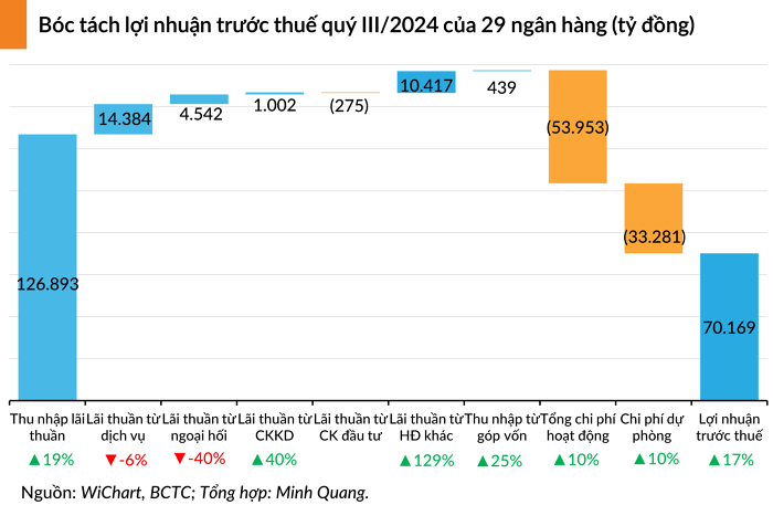 Cụ thể, dữ liệu từ WiChart và báo cáo tài chính cho thấy thu nhập lãi thuần quý III của 29 ngân hàng đạt 126.893 tỷ đồng, tăng 19% so với cùng kỳ. Sự tăng trưởng trong thu nhập lãi thuần đã giúp tổng thu nhập hoạt động (TOI) tăng thêm khoảng 20.200 tỷ đồng so với quý III năm ngoái, đóng vai trò quan trọng trong việc hỗ trợ tăng trưởng lợi nhuận.