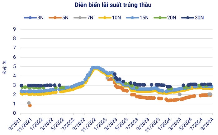 Tuy nhiên, lãi suất trúng thầu đã đi ngang từ giữa năm 2023 đến nay, khiến cơ hội kiếm lời từ lớp tài sản này của các ngân hàng không còn nhiều.
