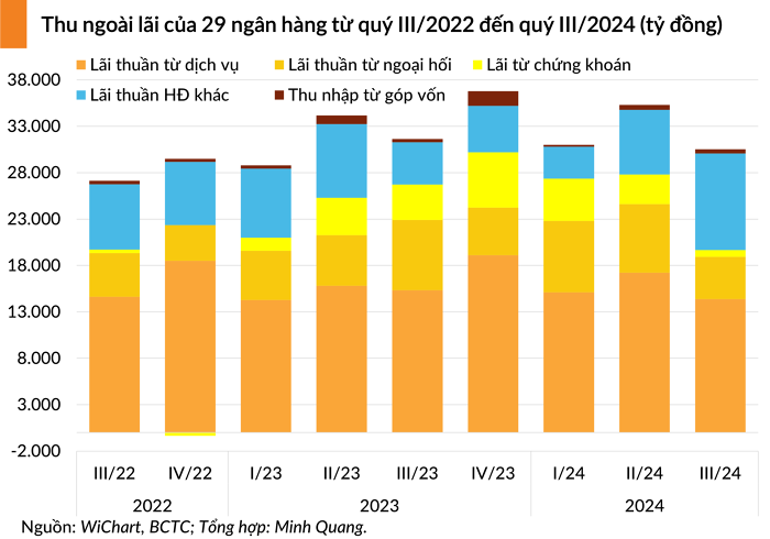 Trong đó, lãi thuần từ dịch vụ của 29 ngân hàng trong quý III là 14.384 tỷ đồng, giảm 6,3% so với cùng kỳ. Mảng dịch vụ tiếp tục chịu áp lực từ cuộc khủng hoảng niềm tin trên thị trường bảo hiểm cũng như những khó khăn của thị trường trái phiếu doanh nghiệp.