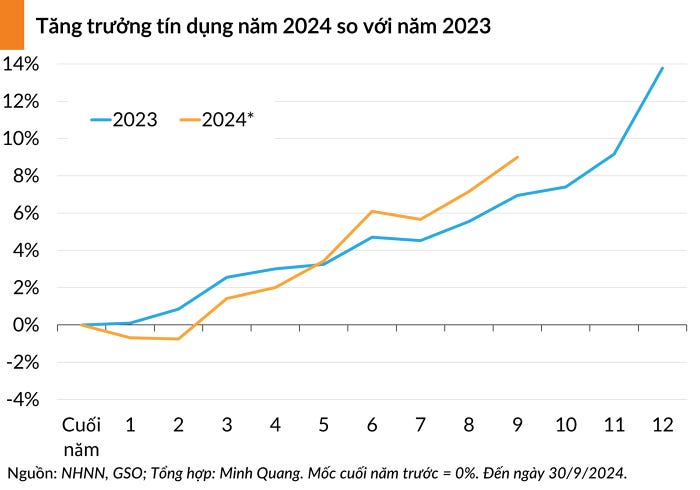 Tại Phiên họp Chính phủ thường kỳ tháng 9/2024, Thống đốc Nguyễn Thị Hồng thông tin tính đến ngày 30/9, tín dụng tăng 9% so với đầu năm và tăng 16% so với cùng kỳ năm trước. Đồng thời, kết quả tăng trưởng tín dụng trong 9 tháng năm 2024 cũng cao hơn đáng kể so với cùng kỳ năm trước (6,95%).