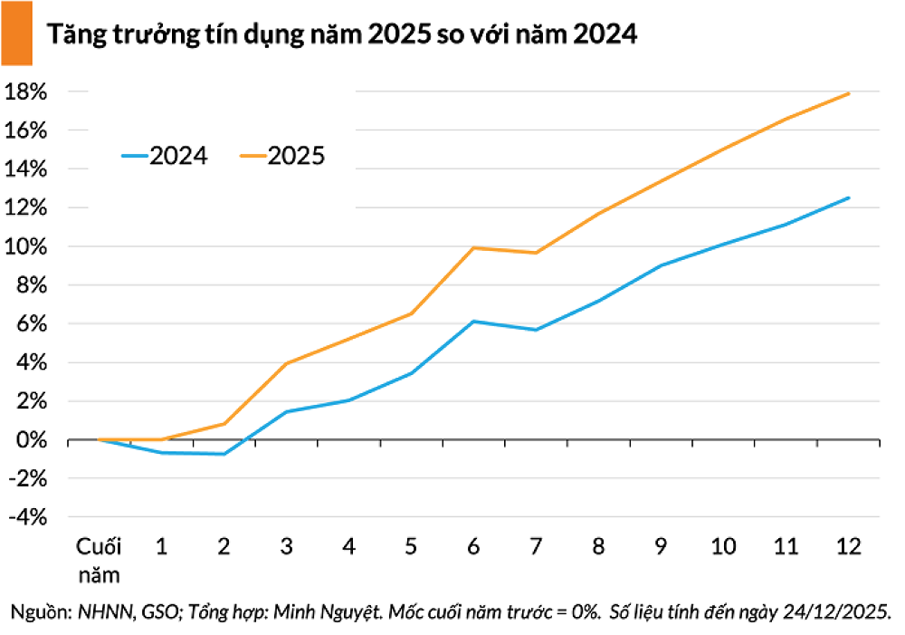 Nhìn lại năm 2025, NHNN định hướng tăng trưởng tín dụng khoảng 16%, song thực tế TTTD toàn hệ thống đạt gần 18% (tính đến ngày 24/12), nhằm hỗ trợ mục tiêu tăng trưởng GDP trên 8%. Bước sang năm 2026, khi mục tiêu tăng trưởng GDP được nâng lên mức hai chữ số, câu hỏi đặt ra là liệu mục tiêu tăng trưởng tín dụng có đủ để tiếp tục đóng vai trò là động lực chính cho tăng trưởng kinh tế.
