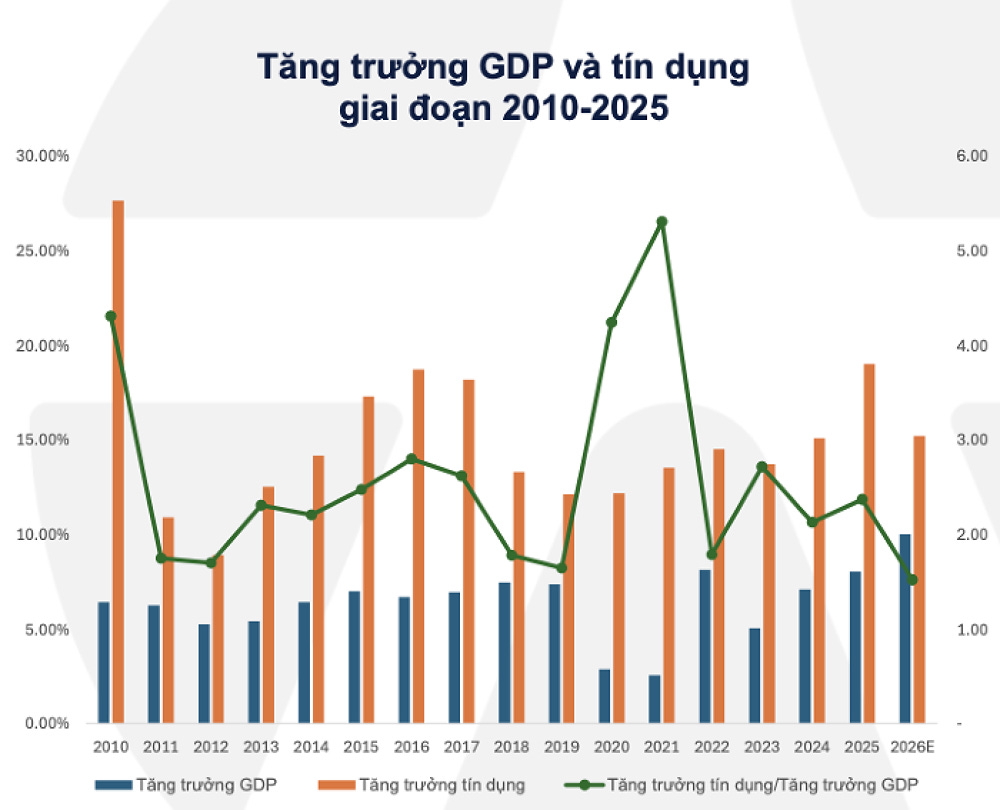 Dẫn số liệu từ báo cáo Yuanta Việt Nam, kết thúc năm 2025, tăng trưởng GDP và tăng trưởng tín dụng đạt lần lượt 8,02% và 19,01%, tỷ lệ tăng trưởng tín dụng/GDP đạt 2,37 lần, cao hơn mức tỷ lệ trung bình giai đoạn 2010-2025 là 1,64 lần.
