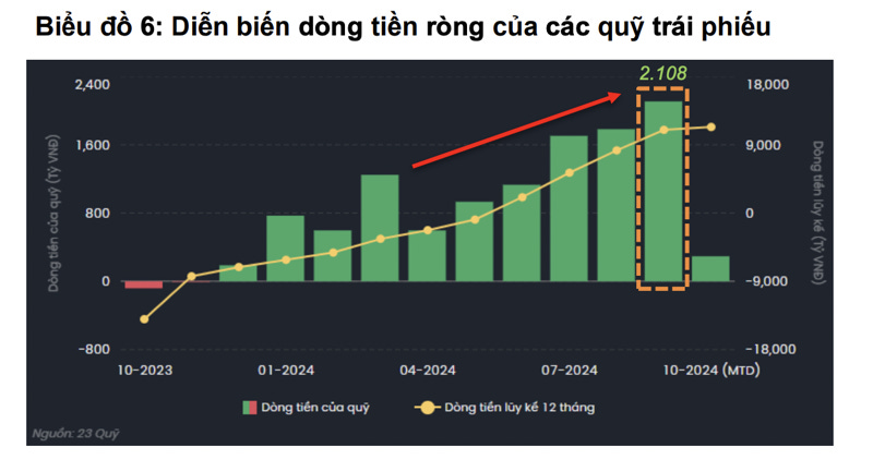 Dòng vốn đầu tư vào các quỹ trái phiếu duy trì đà vào ròng trong tháng 9/2024, đạt 2,1 nghìn tỷ đồng với mức tăng trưởng 18,3% so với tháng 8/2024. Đây là tháng thứ 10 liên tiếp dòng vốn vào ròng tích
