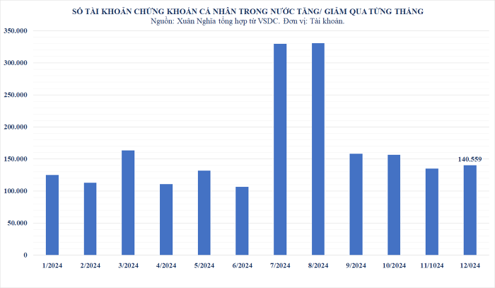 Lũy kế cả năm 2024, số lượng tài khoản của cá nhân trong nước đã tăng 2 triệu tài khoản. Tính trung bình, thị trường gia tăng khoảng 167.000 tài khoản giao dịch cá nhân trong nước mỗi tháng, trong đó cao nhất vào tháng 8/2024 và thấp nhất là tháng 4/2024.