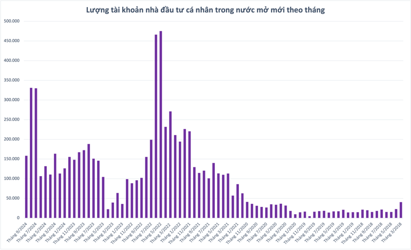 Nhà đầu tư cá nhân tiếp tục mở mới tài khoản trong bối cảnh thị trường liên tục biến động trong tháng 9 vừa qua, đặc biệt khi cơn bão Yagi tàn khốc càn quét gây ảnh hưởng mạnh tới kinh tế khu vực miền Bắc cùng với những sự kiện trên thế giới như Fed hạ lãi suất, lo ngại suy thoái kinh tế Mỹ.