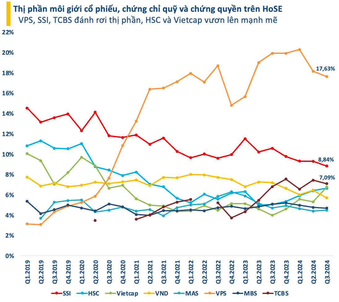 VPS vẫn dẫn đầu về thị phần môi giới trên HoSE trong quý 3 vừa qua nhưng thị phần đã bị thu hẹp đáng kể xuống mức 17,63% - thấp nhất trong vòng hơn một năm kể từ quý 2/2023.