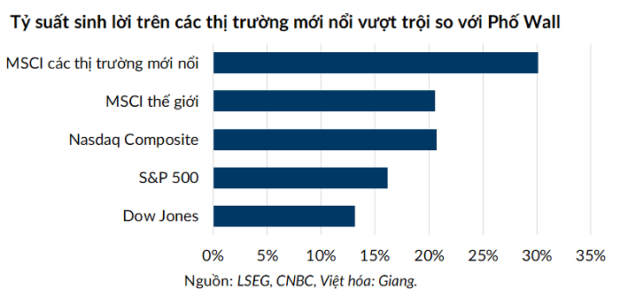 Chỉ số các thị trường mới nổi của MSCI đã tăng khoảng 30% kể từ đầu năm nay, vượt mặt thành tích cả ba chỉ số chứng khoán chính của Phố Wall. Và chỉ số thế giới của MSCI - bao gồm cổ phiếu niêm yết tại các thị trường phát triển như Mỹ - chỉ tăng 20% trong năm 2025.
