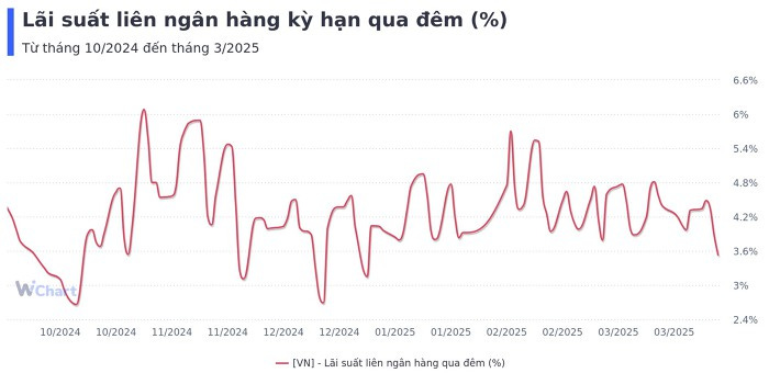 Theo đó, lãi suất cho vay qua đêm bắt đầu ở mốc 4,74% tại ngày 4/3, sau đó giảm xuống 3,88% tại phiên 7/3 và phục hồi trở lại ở mốc 4,81% vào giữa tháng 3, tiếp tục xu hướng giảm chủ đạo trong nửa tháng còn lại. Tại phiên 28/3 lãi suất cho vay qua đêm ghi nhận ở mốc 3,53%, mức thấp nhất trong tháng, giảm 1,28 điểm % so với mức đỉnh trong tháng.