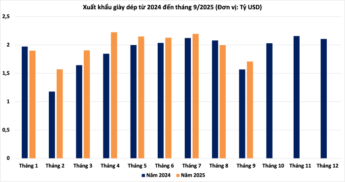 Mặc dù vậy, nếu so sánh với từng tháng, xuất khẩu da giày trong tháng 9 giảm mạnh 14% so với tháng 8. Trong đó, Mỹ - thị trường chiếm tỷ trọng cao nhất, đóng góp lớn vào mức sụt giảm này. Cụ thể, xuất khẩu sang thị trường này giảm 27% so với tháng 8 xuống 611 triệu USD. Đây là một trong những mặt hàng ghi nhận mức giảm mạnh nhất khi xuất khẩu sang Mỹ do tác động của thuế quan.