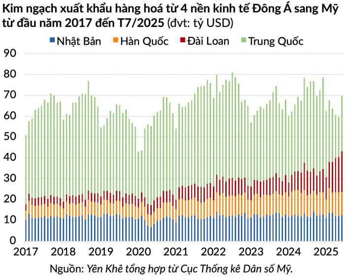 Tương tự, dòng chảy thương mại giữa Mỹ với Nhật Bản và Hàn Quốc cũng khó thay đổi đáng kể. Nhật Bản đã ký kết thoả thuận thuế quan và đầu tư với Mỹ, trong khi Hàn Quốc chưa đặt bút ký thoả thuận thương mại.