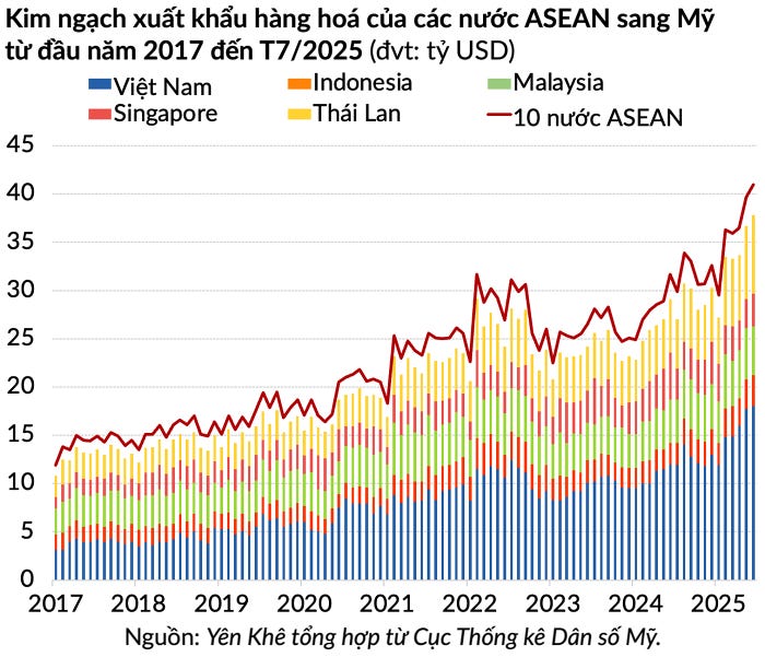Tác động đến dòng chảy thương mại từ Đông Nam Á có thể sẽ lớn hơn do xuất khẩu hàng hoá từ Việt Nam, Thái Lan và các nước khác trong khu vực đã tăng vọt trong năm nay, một phần do doanh nghiệp cố gắng tích trữ hàng trước thuế quan.