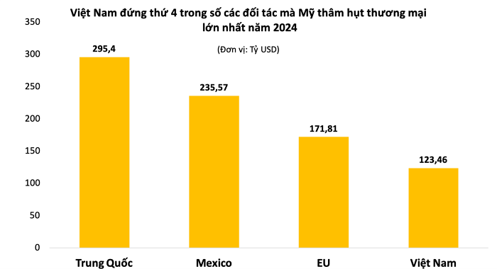 Trên thực tế, Mỹ ghi nhận thâm hụt thương mại rất lớn với Việt Nam (tới 123 tỷ USD năm 2024) liên tục có xu hướng tăng. Một số quốc gia mà Mỹ thâm hụt lớn như: Trung Quốc, Mexico hay Canada đều đã có phương án áp thuế, vì vậy rủi ro của Việt Nam là rất lớn.
