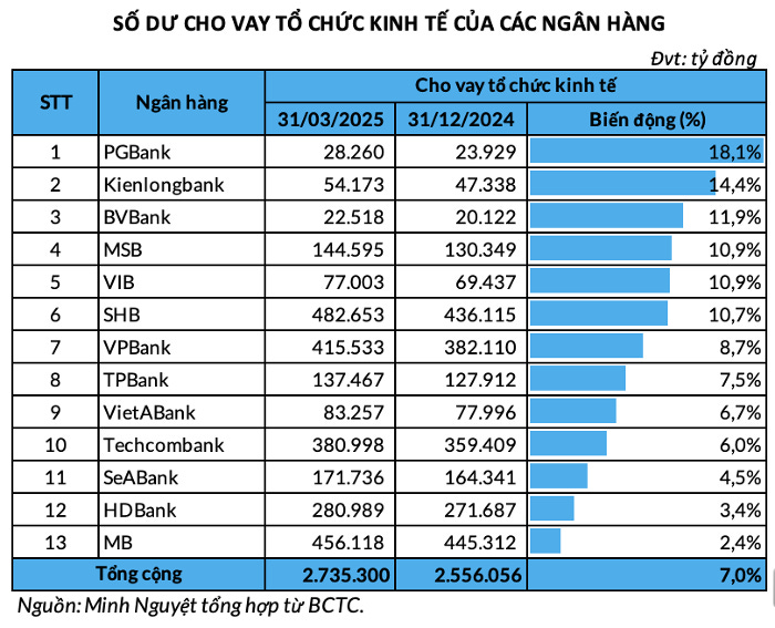 Một số ngân hàng ghi nhận mức tăng trưởng tín dụng doanh nghiệp hai chữ số, gồm PGBank (tăng 18,1%), Kienlongbank (14,4%), BVBank (11,9%), MSB (10,9%), VIB (10,9%) và SHB (10,7%).