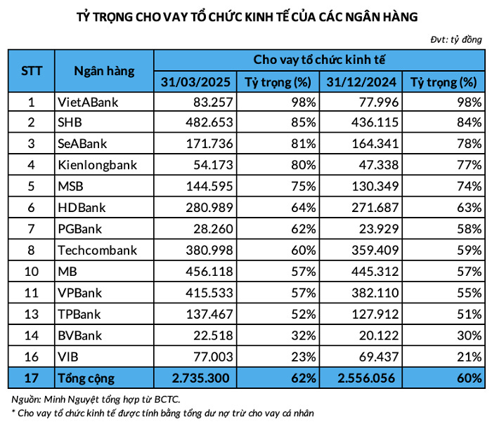 Dữ liệu cũng cho thấy, tỷ trọng cho vay tổ chức kinh tế tại toàn nhóm 13 ngân hàng khảo sát đạt 62% vào cuối quý I/2025, tăng nhẹ so với mức 60% cuối năm 2024. Diễn biến này phần nào phản ánh khẩu vị rủi ro của các ngân hàng đang nghiêng về phía doanh nghiệp trong bối cảnh thị trường tiêu dùng chưa thật sự phục hồi.