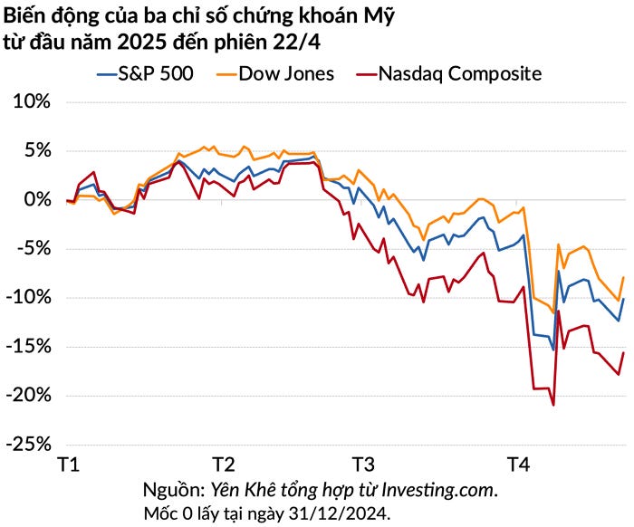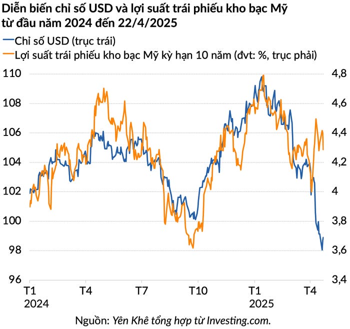 Đơn cử như trong phiên giao dịch ngày 21/4, những lo ngại về tính độc lập của Fed đã khiến ba chỉ số chính của chứng khoán Mỹ bốc hơi hơn 2%, trái phiếu kho bạc Mỹ bị bán tháo và đồng USD chạm mức yếu nhất trong ba năm.