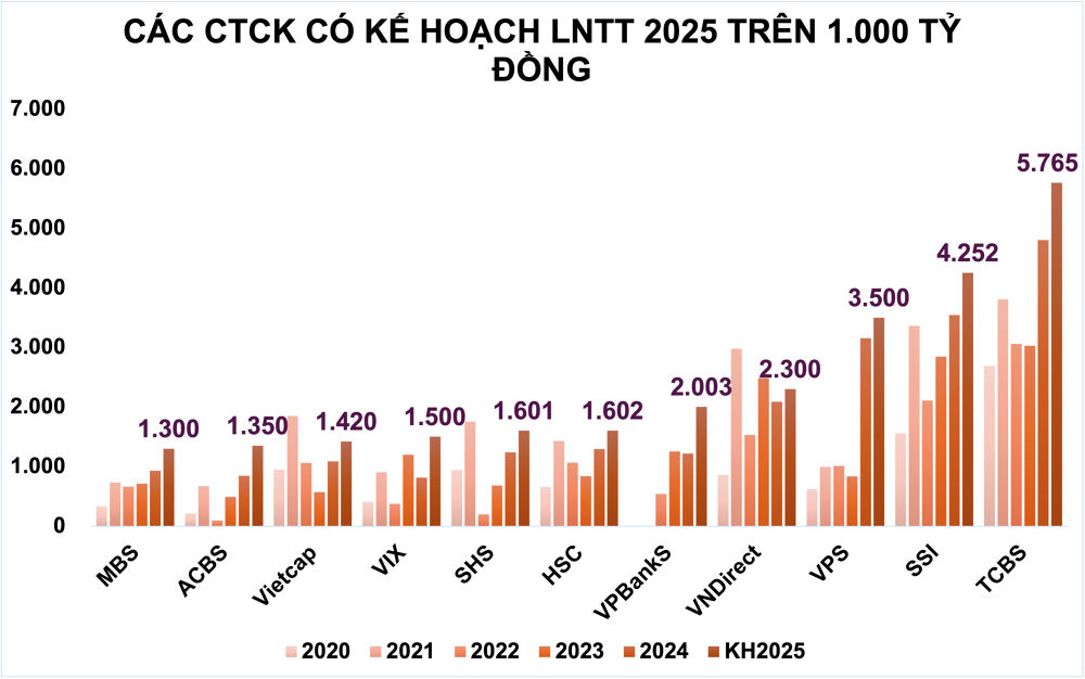 TCBS đặt mục tiêu doanh thu 9.323 tỷ đồng và lợi nhuận trước thuế 5.765 tỷ đồng, cao nhất toàn ngành. SSI cũng đặt kế hoạch lãi trước thuế 4.252 tỷ đồng, tăng 20% so với năm 2024. VPBankS hướng đến mức lãi 2.003 tỷ đồng., tăng 64%.