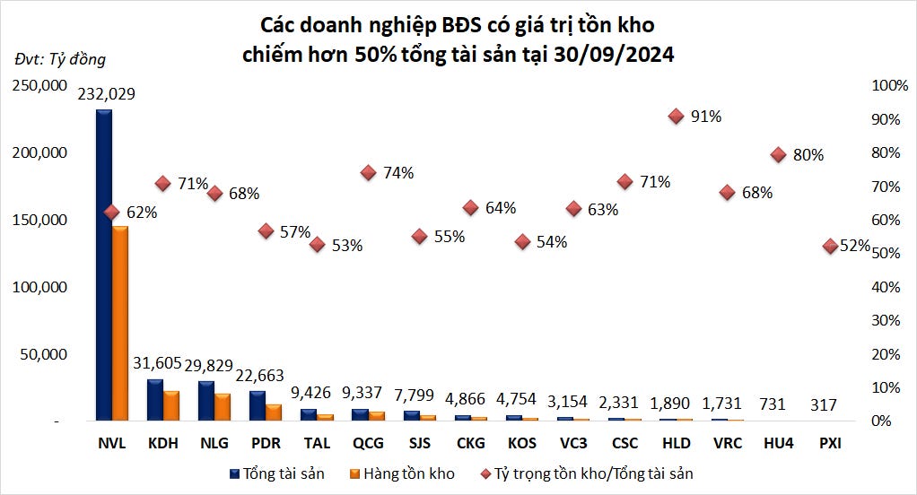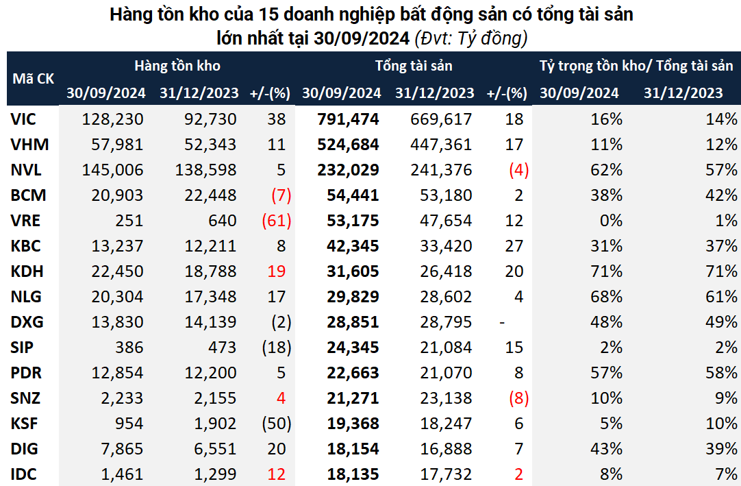 Tính đến cuối quý 3/2024, có 15 doanh nghiệp bất động sản có hàng tồn kho chiếm trên 50% tổng tài sản, tăng thêm 1 doanh nghiệp so với thời đầu năm, chủ yếu là doanh nghiệp bất động sản nhà ở.