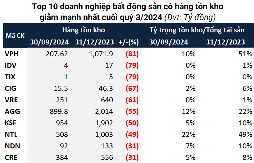 Trái ngược, ở nhóm giảm, đáng chú ý là CTCP Vạn Phát Hưng (HOSE: VPH) có tồn kho giảm mạnh 81%, về còn gần 208 tỷ đồng, do ghi nhận giảm chi phí sản xuất kinh doanh dở dang tại các dự án.