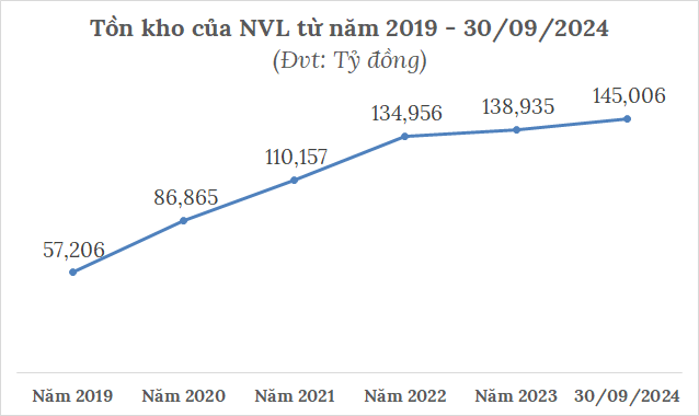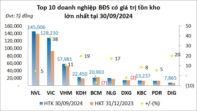 Thống kê từ VietstockFinance với 116 doanh nghiệp (trên HOSE, HNX và UPCoM) công bố BCTC quý 3/2024 thuộc nhóm bất động sản bao gồm nhà ở và khu công nghiệp, tổng giá trị hàng tồn kho tính đến 30/9/2024 cao kỷ lục với hơn 531.8 ngàn tỷ đồng, tăng 12% so với đầu năm và là quý thứ 5 tăng liên tiếp (từ quý 2/2023). Trong đó, có 58 doanh nghiệp tăng, 13 không đổi và 45 doanh nghiệp giảm tồn kho so với đầu năm.